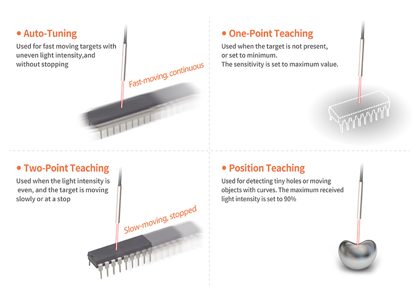 Depending on the environment, users can choose between auto-tuning, one-point teaching (maximum sensitivity), two-point teaching, and position teaching modes.