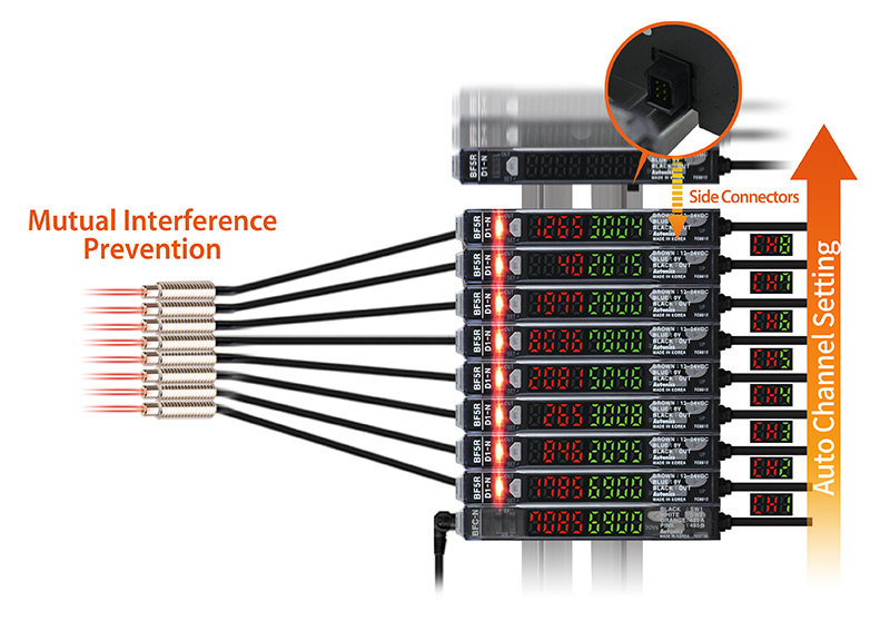 - Mutual interference prevention allows adjacent installation (up to 8 units) with side connectors