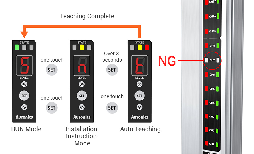 The installation instruction mode allows users to check if the detection target object is in proper position using the output indicators. The auto teaching function allows all sensing channels to be set in uniform light amount for optimal sensitivity setting.