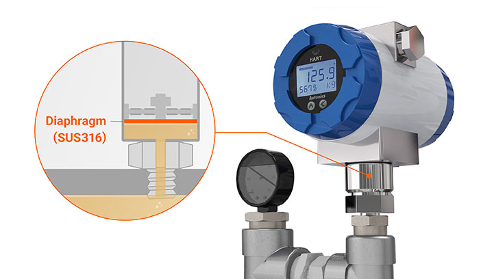 The stainless steel diaphragm (SUS 316L) allows pressure measurement in various environments and offer high corrosion resistance.