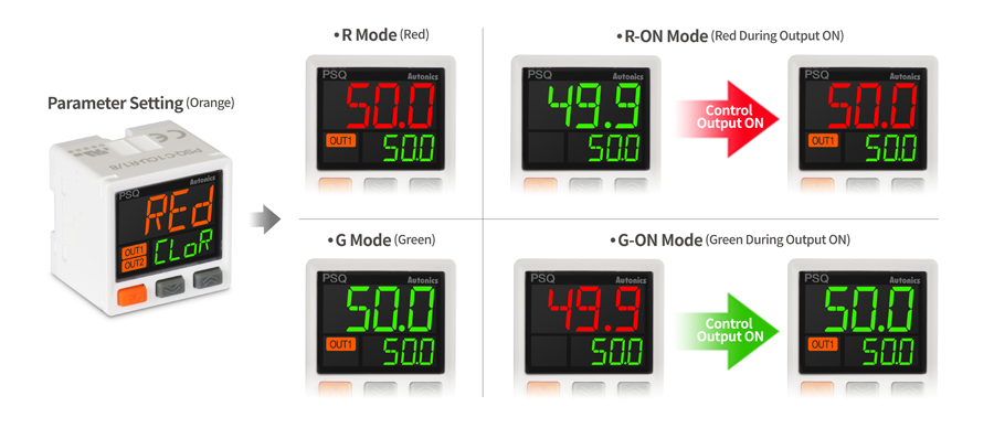 Users can choose between four color modes for the PV display. (R Mode, G Mode, R-ON Mode, G-ON Mode). The main display will always be displayed in orange during parameter configuration or while copying parameter settings.