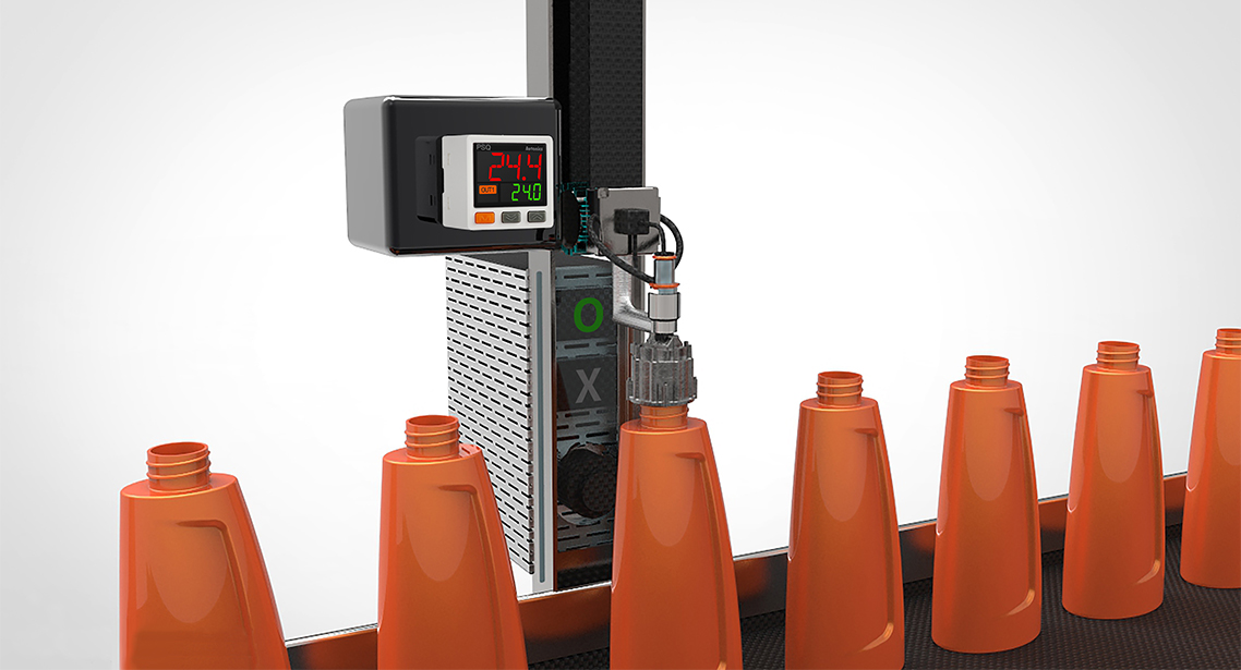 Dual display pressure sensors are used for air-leak test of PET bottles during packaging material manufacturing.
