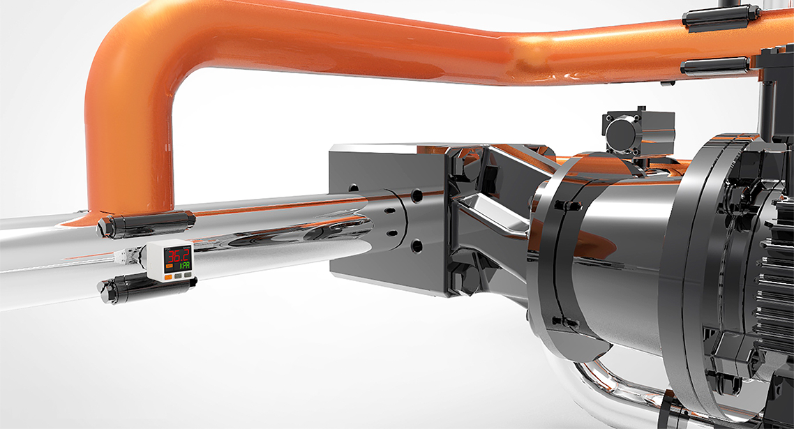 Dual display pressure sensors are used to check and confirm reference pressure in pipes of packaging lines.